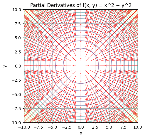 Quiver plots display vector fields by drawing arrows to represent the vectors at various points in the 2D space. In the context of our example, the quiver plot is used to visualise the partial derivatives of the function \(f(x, y) = x^2 + y^2\) at various points in the \(xy\) plane.