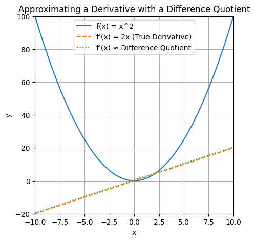 ax.plot(x_values, diff_quot_values, label="f'(x) ≈ Difference Quotient", linestyle=":")